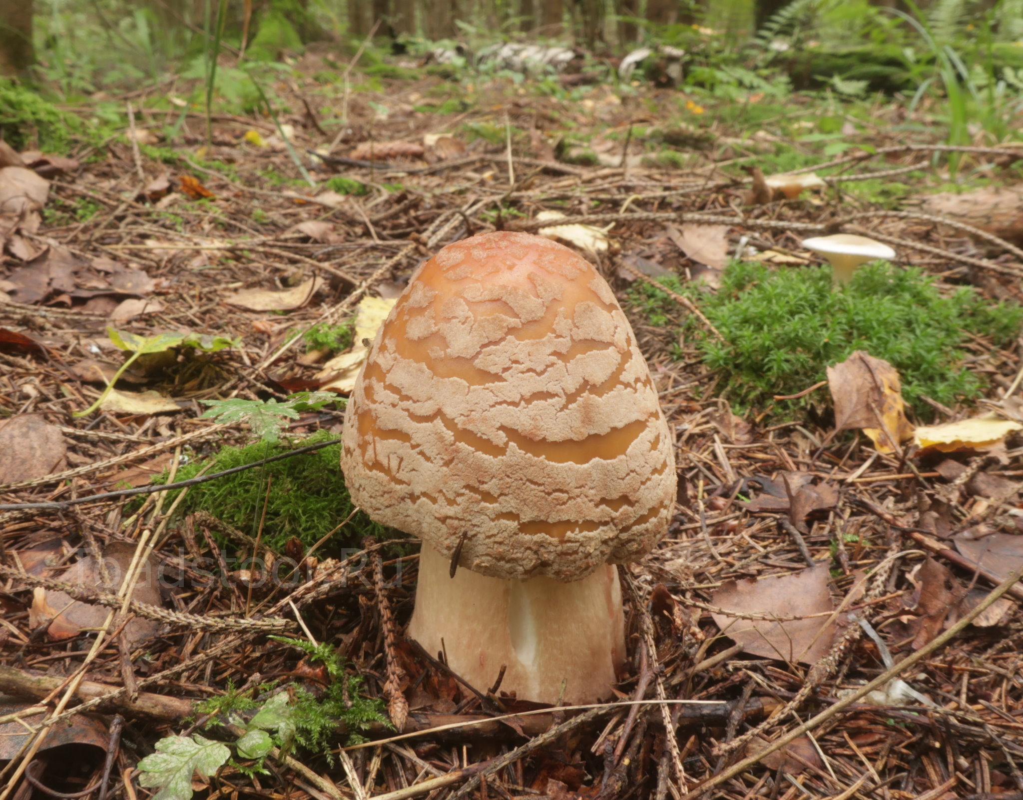 Этот мухомор совершенен, но внимание привлекают две незначительные детали. Во-первых, крошечный отпрыск-мухоморчик в основании, во-вторых - подберёзовик на заднем плане. Такая жизнь.