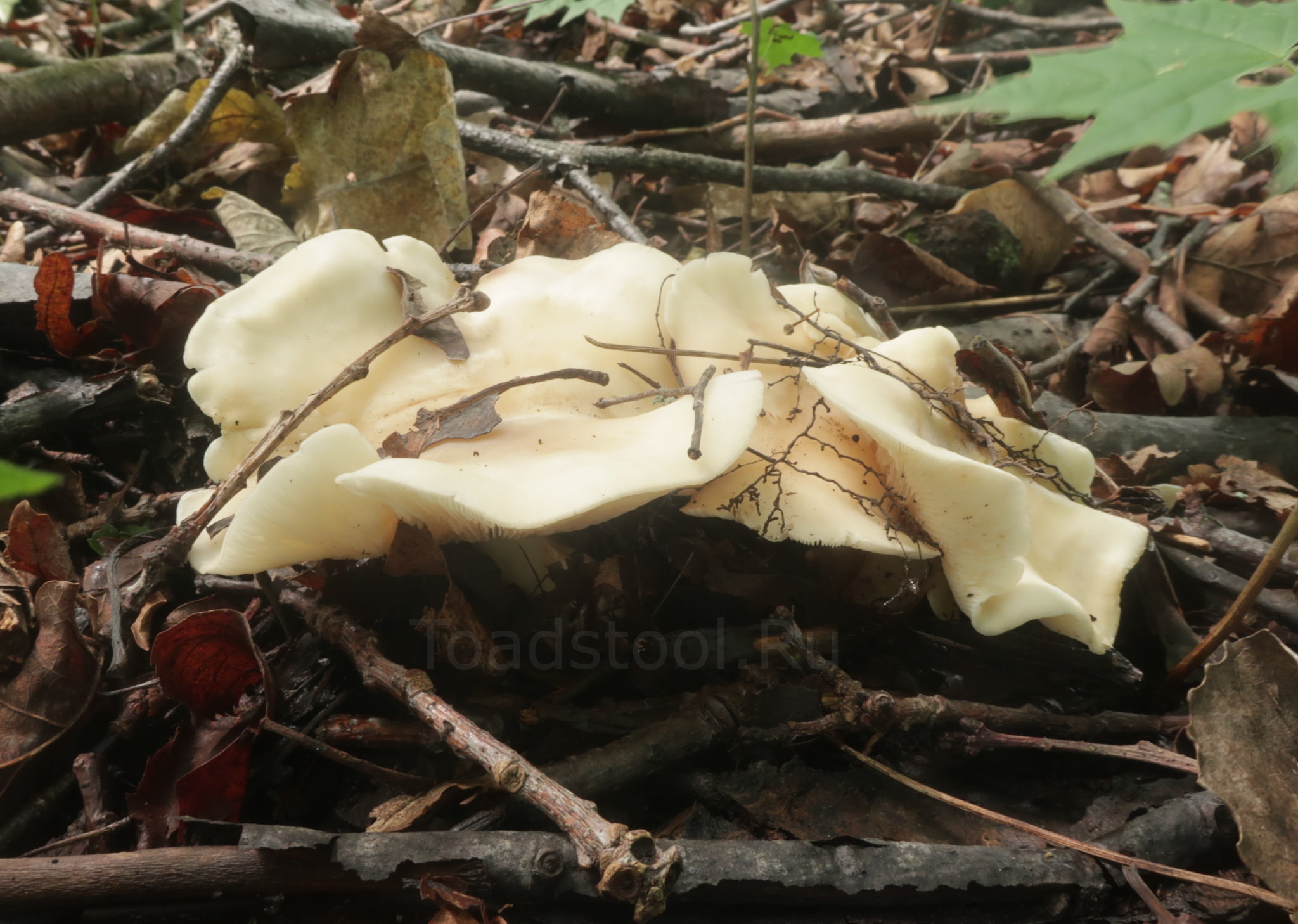 Гименофор: Пластинки частые, узкие, приросшие зубцом, у молодых грибов почти белые, у взрослых — светло-кремовые.
