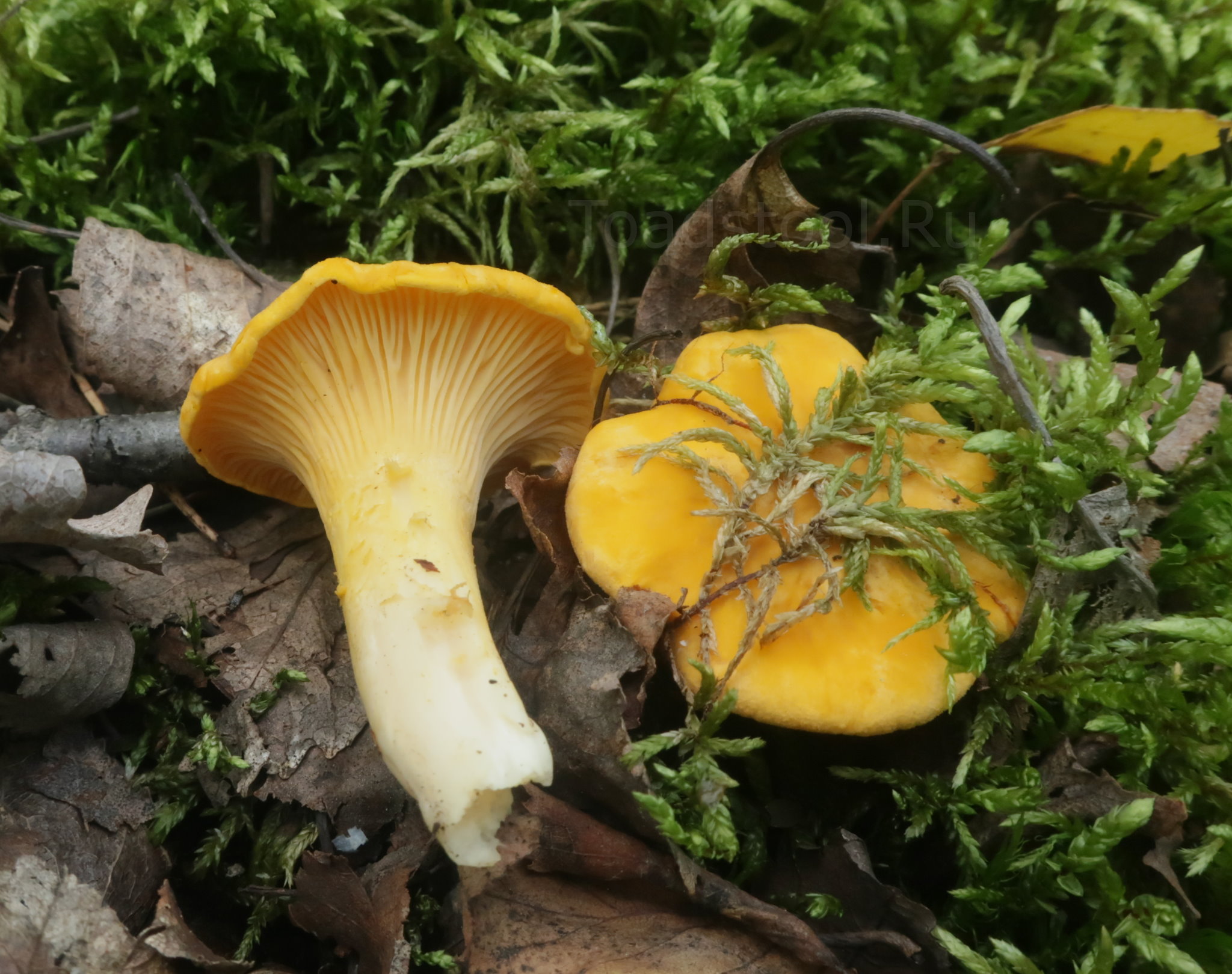Шляпка: Средних размеров, 3-8 (до 10) см в диаметре, вначале сначала слабовыпуклая, почти плоская, затем развивается в направлении воронковидной, по пути теряя правильность очертаний; края зрелых шляпок волнистые, загибающиеся в разных плоскостях. Окраска яично- или оранжево-желтая (в молодости возможен розоватый оттенок), поверхность гладкая, безо всякого налёта, на месте повреждений цвета не меняет. Мякоть плотная, упругая, резинистая, цвета шляпки или светлее, со слабым фруктовым («лисичковым») запахом и чуть островатым вкусом.