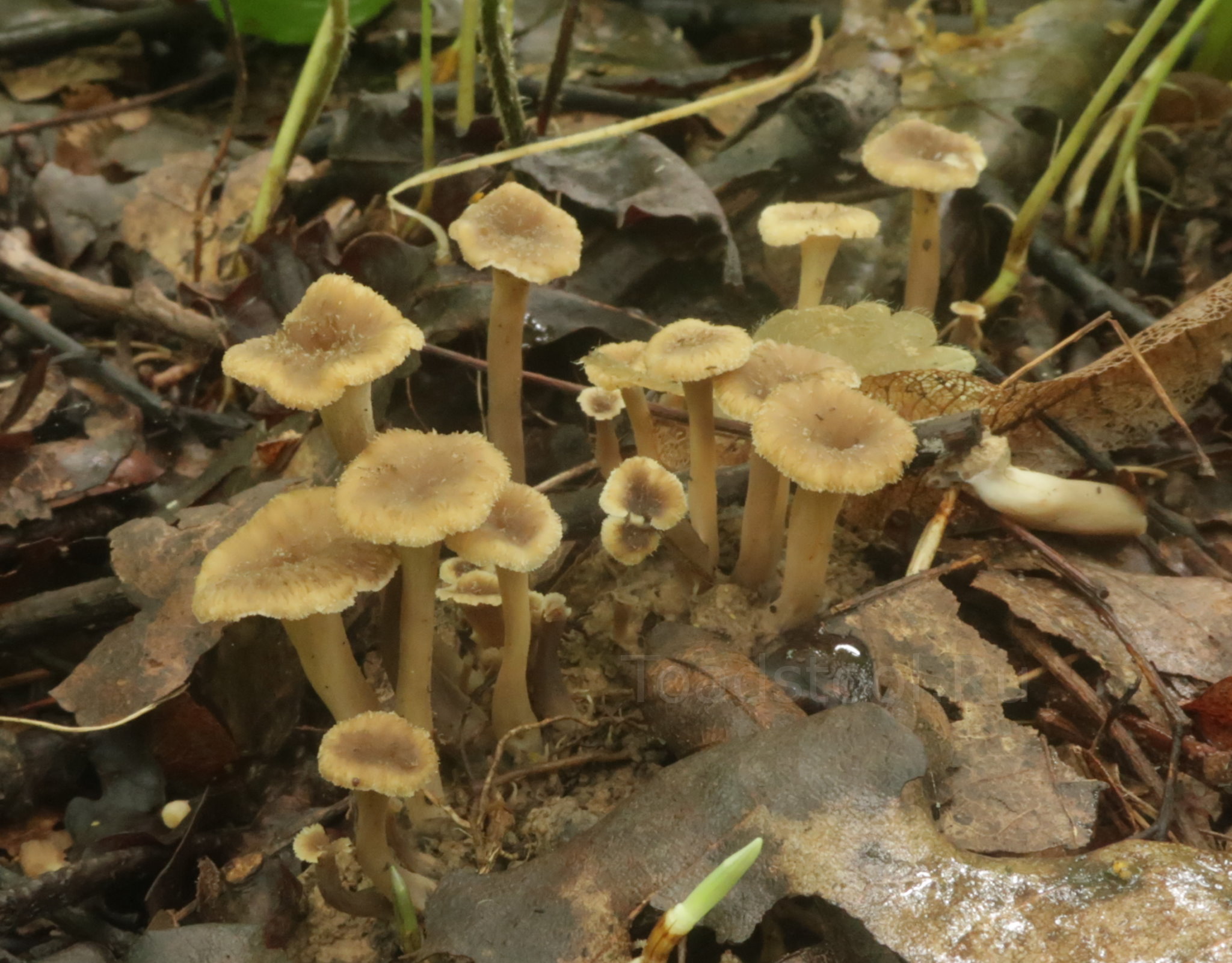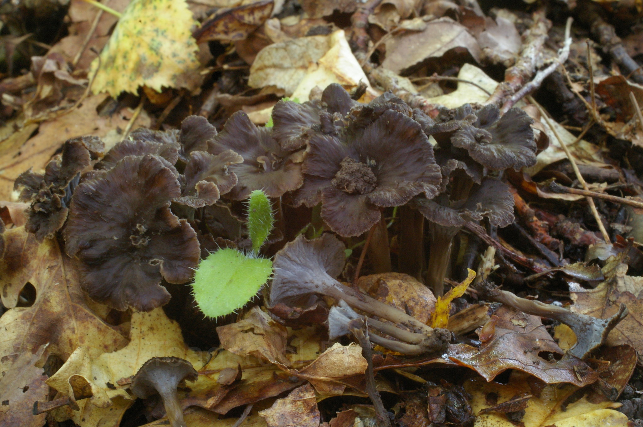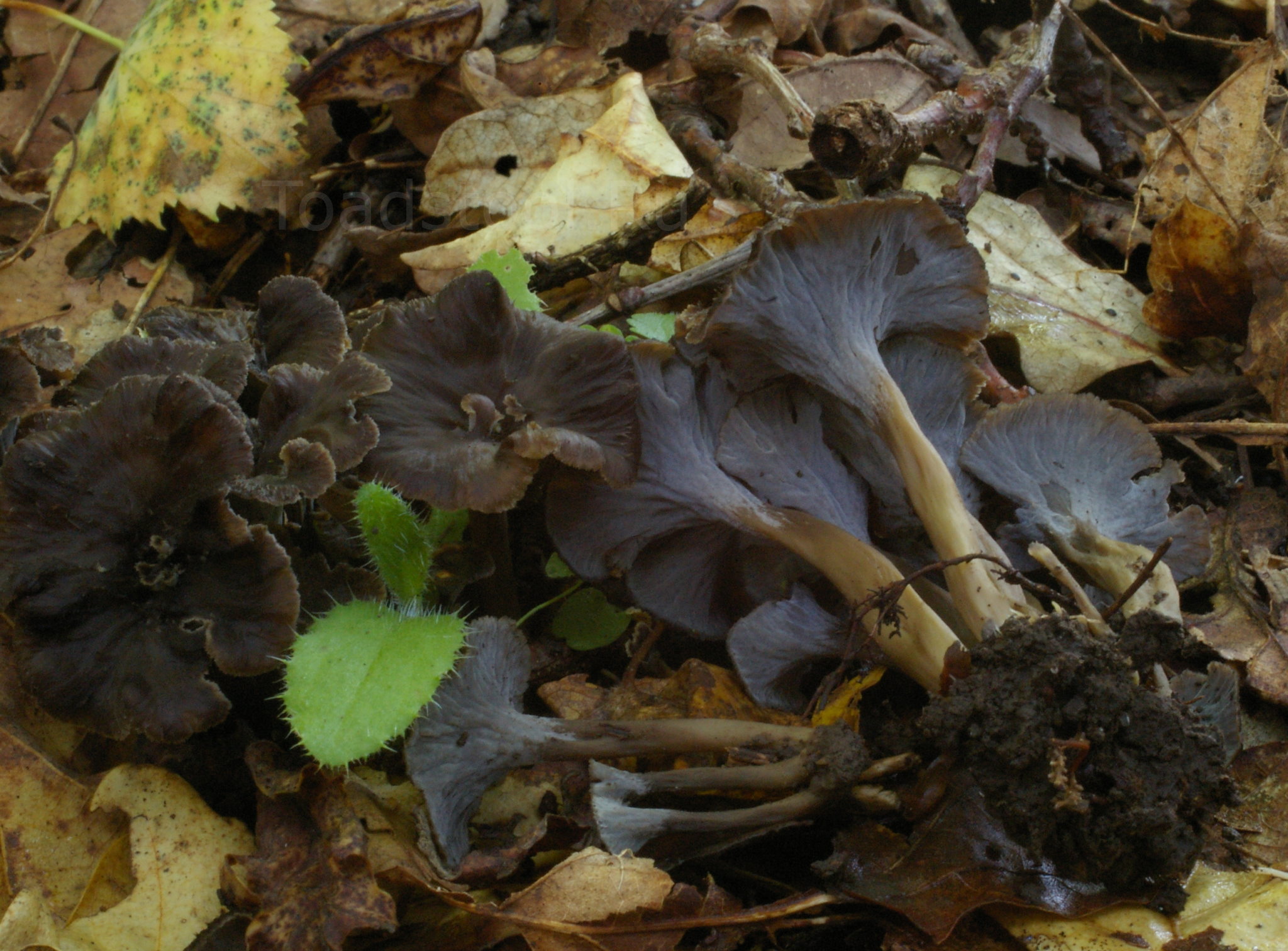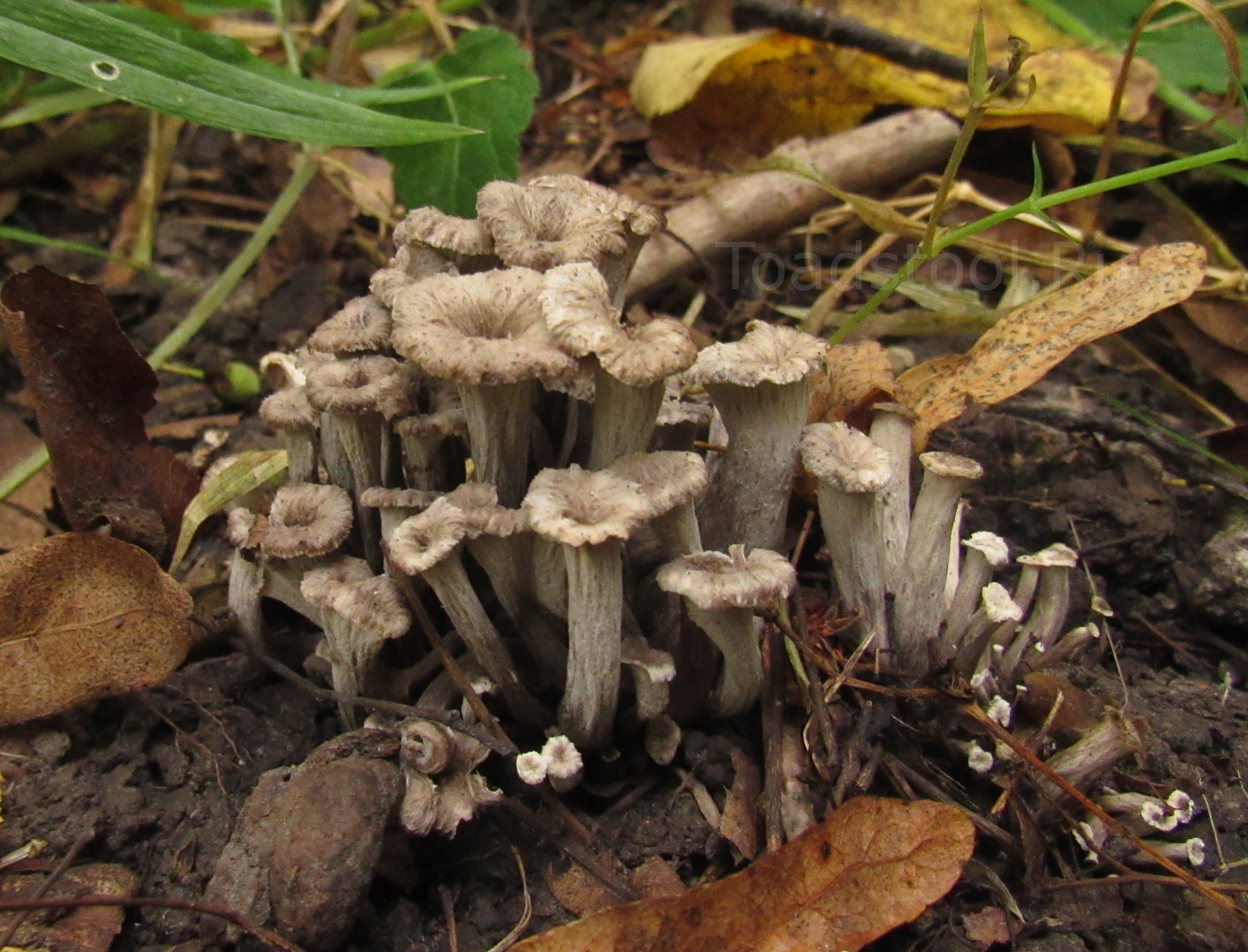 Цветовая гамма, достойная кистей фон Кранаха. Здесь мы можем отчетливо видеть, чем серый псевдовороночник отличается от настоящей серой лисички (Cantharellus cinereus) - практически полным отсутствием пластинкообразных складок под шляпкой.