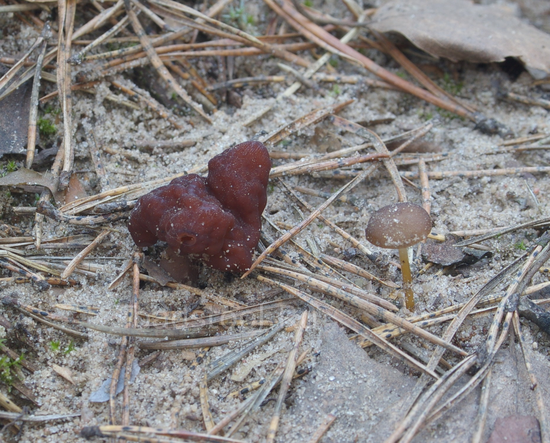 "Перерасти стробилюрус". В местах естественного скопления каких-то сосновых стробилюрусов строчки выглядят особенно инородно. Этот маленький экземпляр Gyromitra esculenta словно демонстрирует настоящему грибу, как выглядят его дальние родственники с других планет. Настоящий гриб явно не испытывает по этому поводу большого энтузиазма.