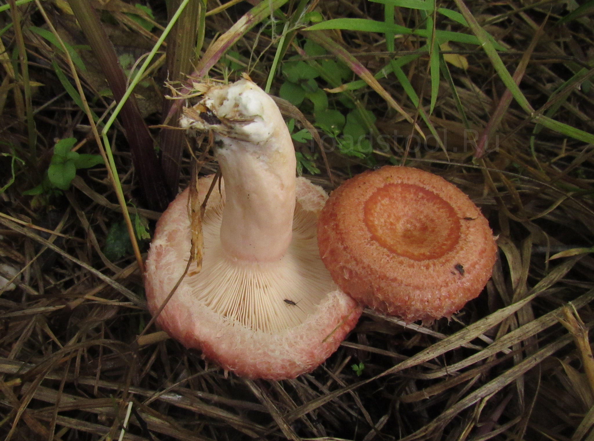 Ножка: Сравнительно короткая и толстая: 3-6 см в высоту, 1-3 см в толщину, цилиндрическая, в молодости сплошная или выполненная, затем полая; поверхность ножки гладкая, окраска бледно-розовая.