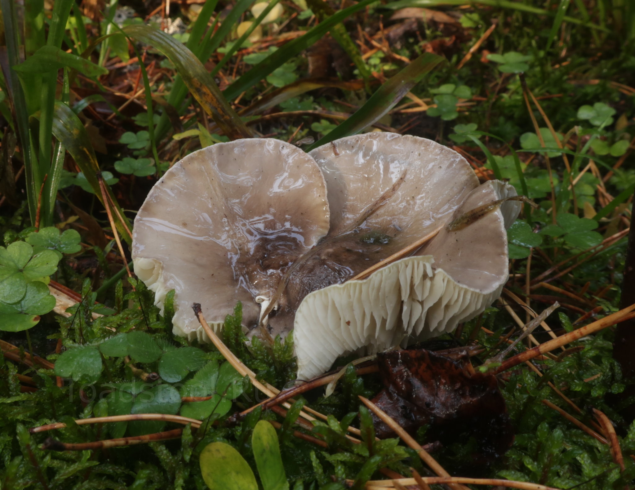 Гименофор: Пластинки широкие, редкие, приросшие зубцом, у молодых рядовок почти белые или желтоватые, с возрастом постепенно сереют.