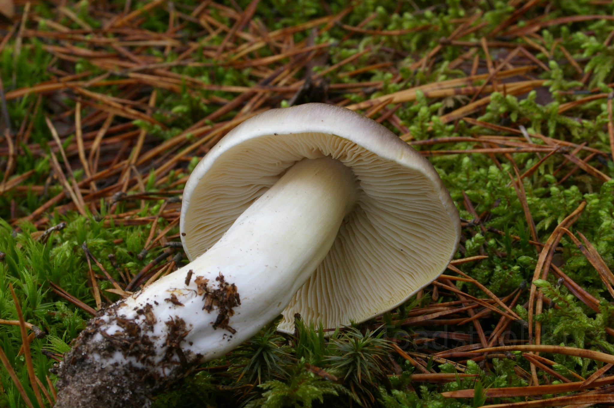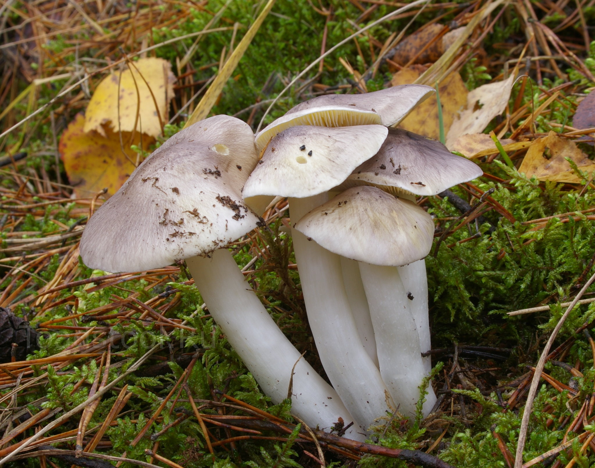 У взрослой Tricholoma portentosum пластинки, как можно видеть, уже не белые, а сероватые с "прожелтью". Впрочем, по сравнению с похожими видами, их можно назвать белыми. У других рядовок всё гораздо хуже.