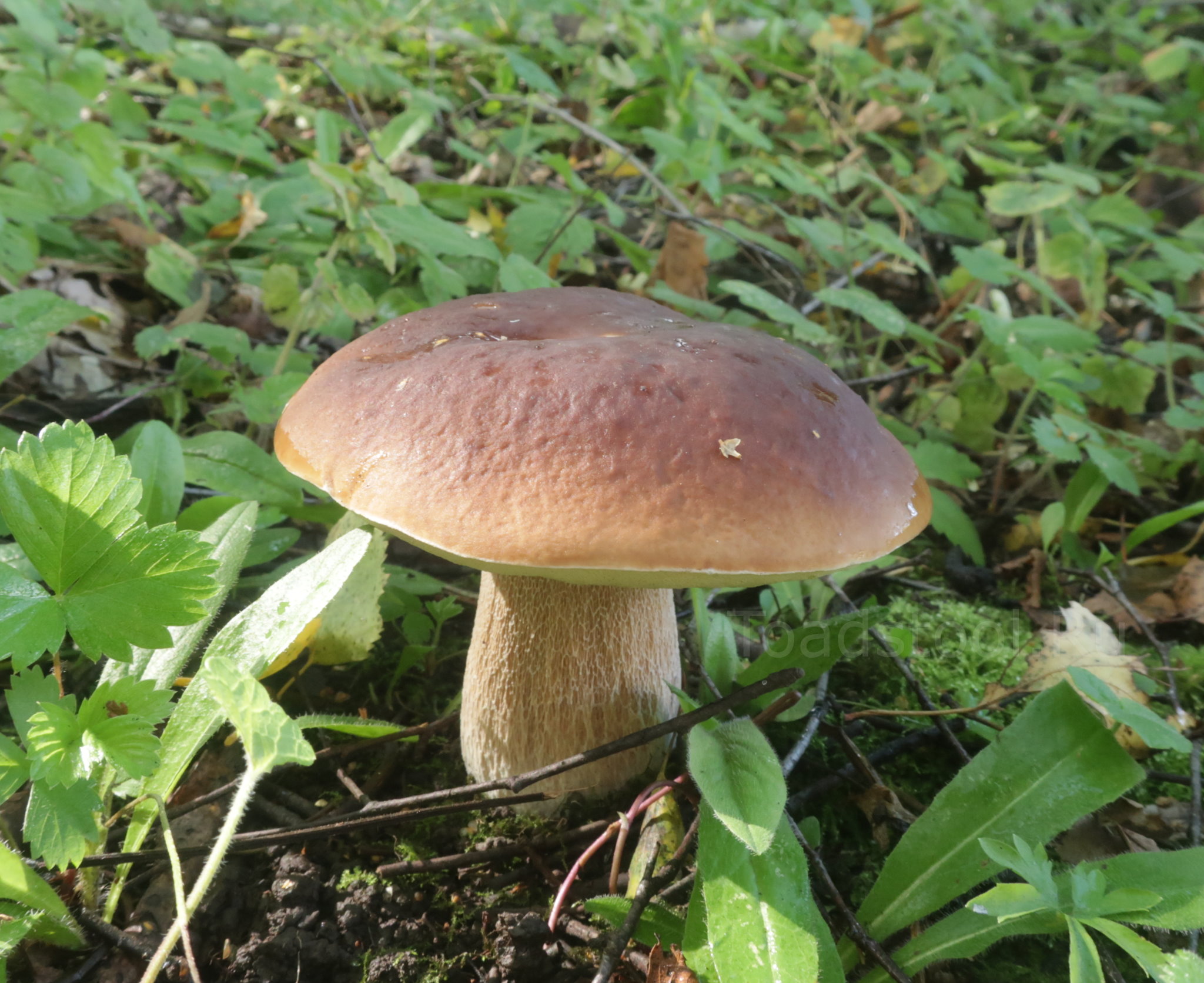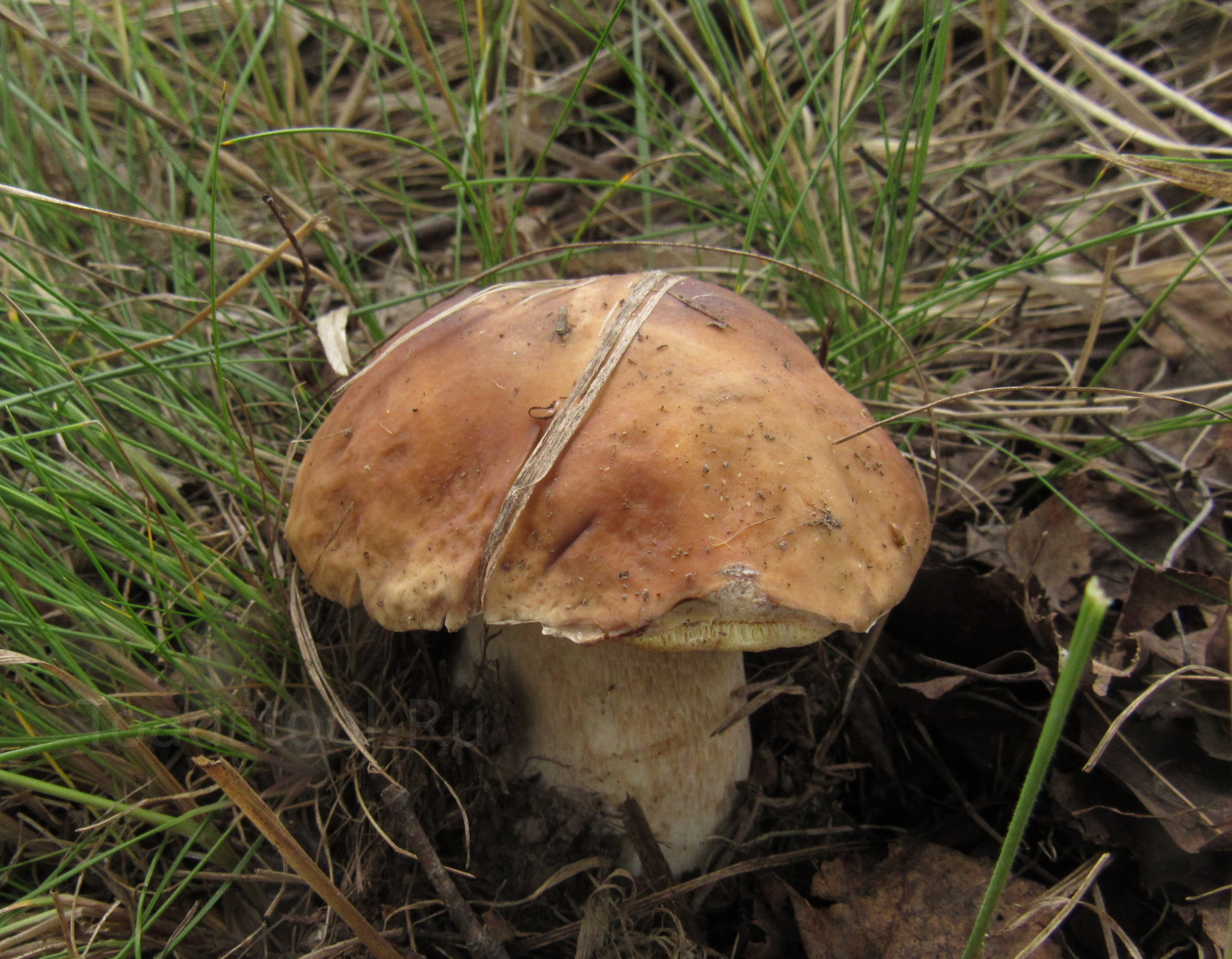 Первый гриб, белый гриб: так выглядит аттестат зрелости, выданный полевым березам. Эти березы я помню вот такими, по колено; когда-то их было еле разглядеть за подберезовиками, а сейчас - пожалуйста, принимайте белый. Да какой! Летит время...