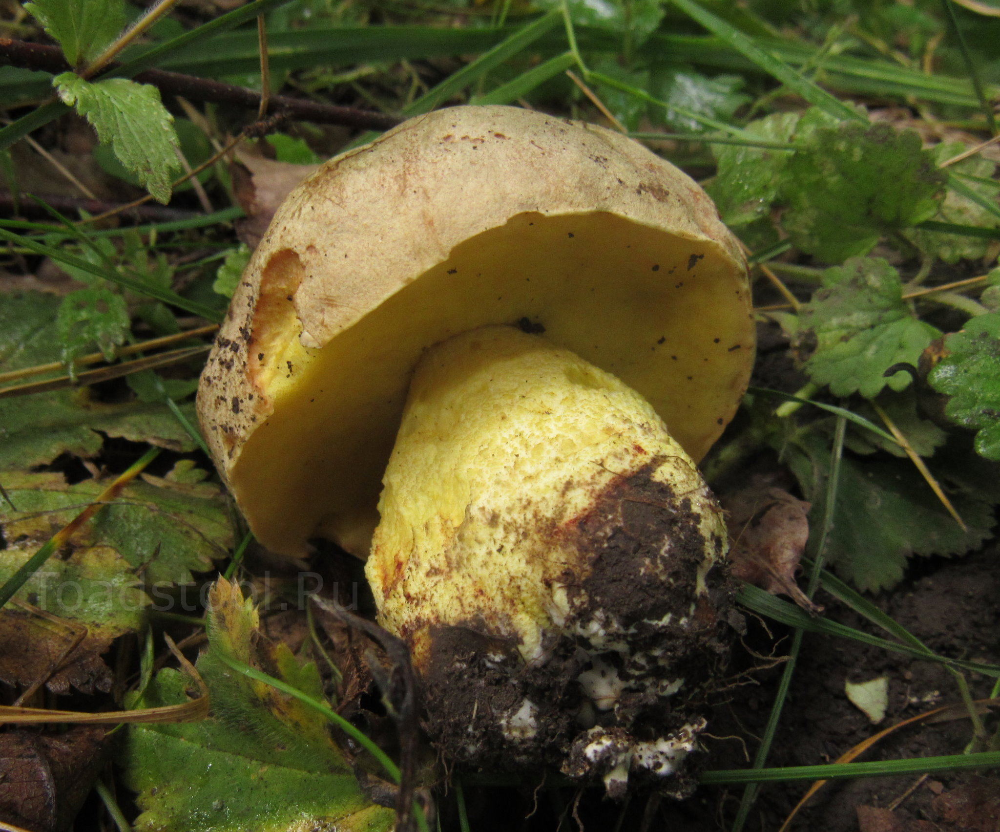 Южные ассоциации укрепляет невероятный яично-желтый цвет молодого гименофора - у нас так не принято. Больше похоже на радикально горький - и тоже южный - болет укореняющийся (Caloboletus radicans), чем на привычный нам белый.