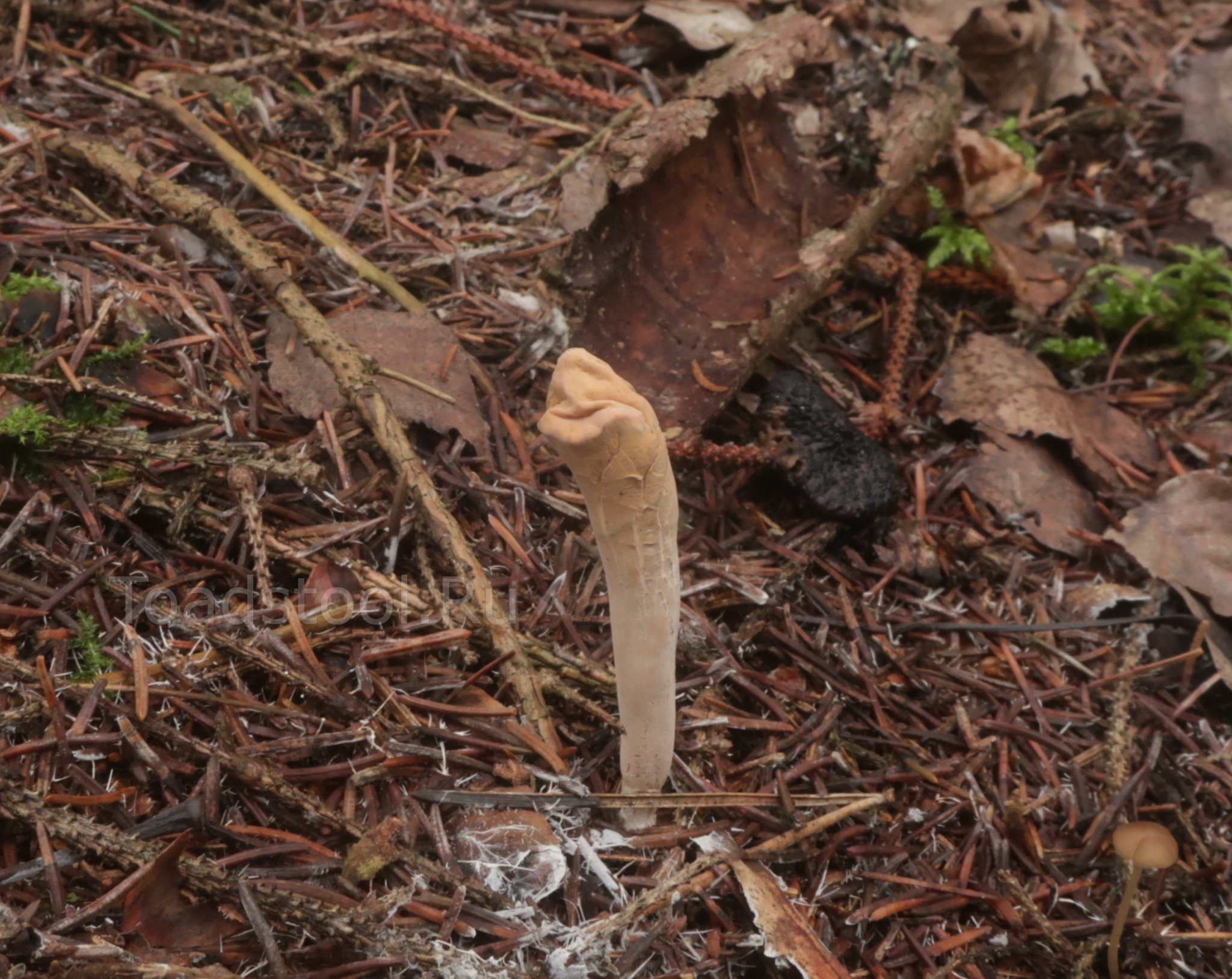Плодовое тело: Вертикальное, языковидной формы, несколько расширенное в верхней части (иногда до формы пестика),часто слегка сплющенное; высота 7-12 см, толщина — 1-3 см (в широкой части). Поверхность тела гладкая и сухая, у основания и у пожилых грибов может быть слегка морщинистая, цвет у молодых экземпляров нежно-кремовый, но с возрастом, по мере созревания спор (которые созревают прямо на поверхности плодового тела) уходит в характерную желтизну. Мякоть светлая, беловатая, сухая, без заметного запаха.