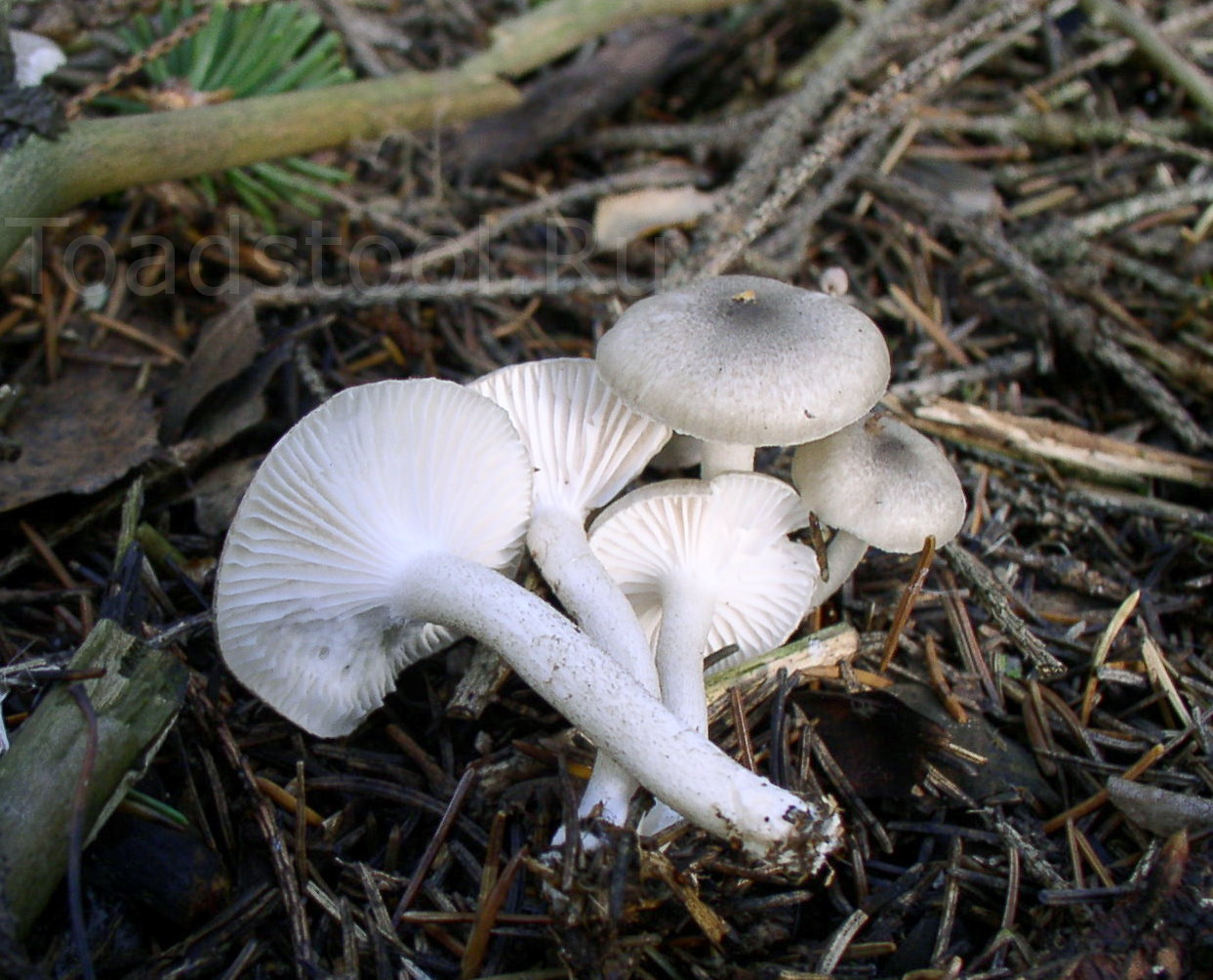 Гименофор: Пластинки редкие, глубоко нисходящие на ножку, белые.