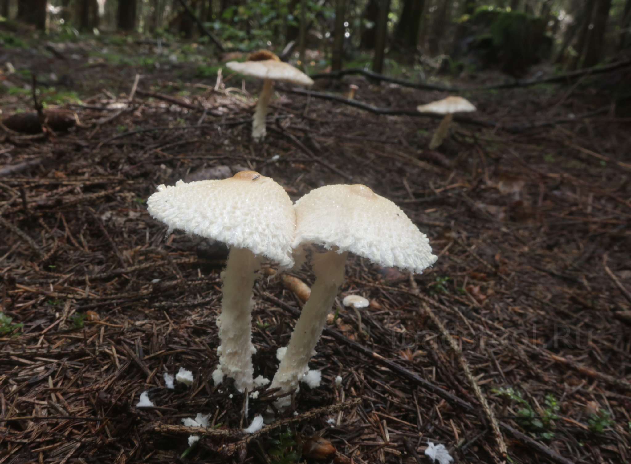 Замечания автора: Зонтик щитовидный — гриб с необоснованными претензиями. Выхватишь взглядом его, интригующе белеющего среди чахлых сосенок, подкрадешься — нет, это не молодой представитель рода Macrolepiota, это старый, через себя переросший зонтик из «маленьких». Как прапорщик воображает себя офицером, а польский гриб — белым.