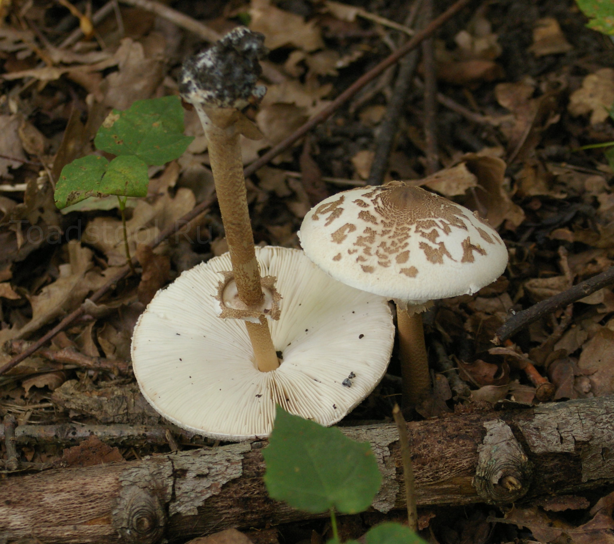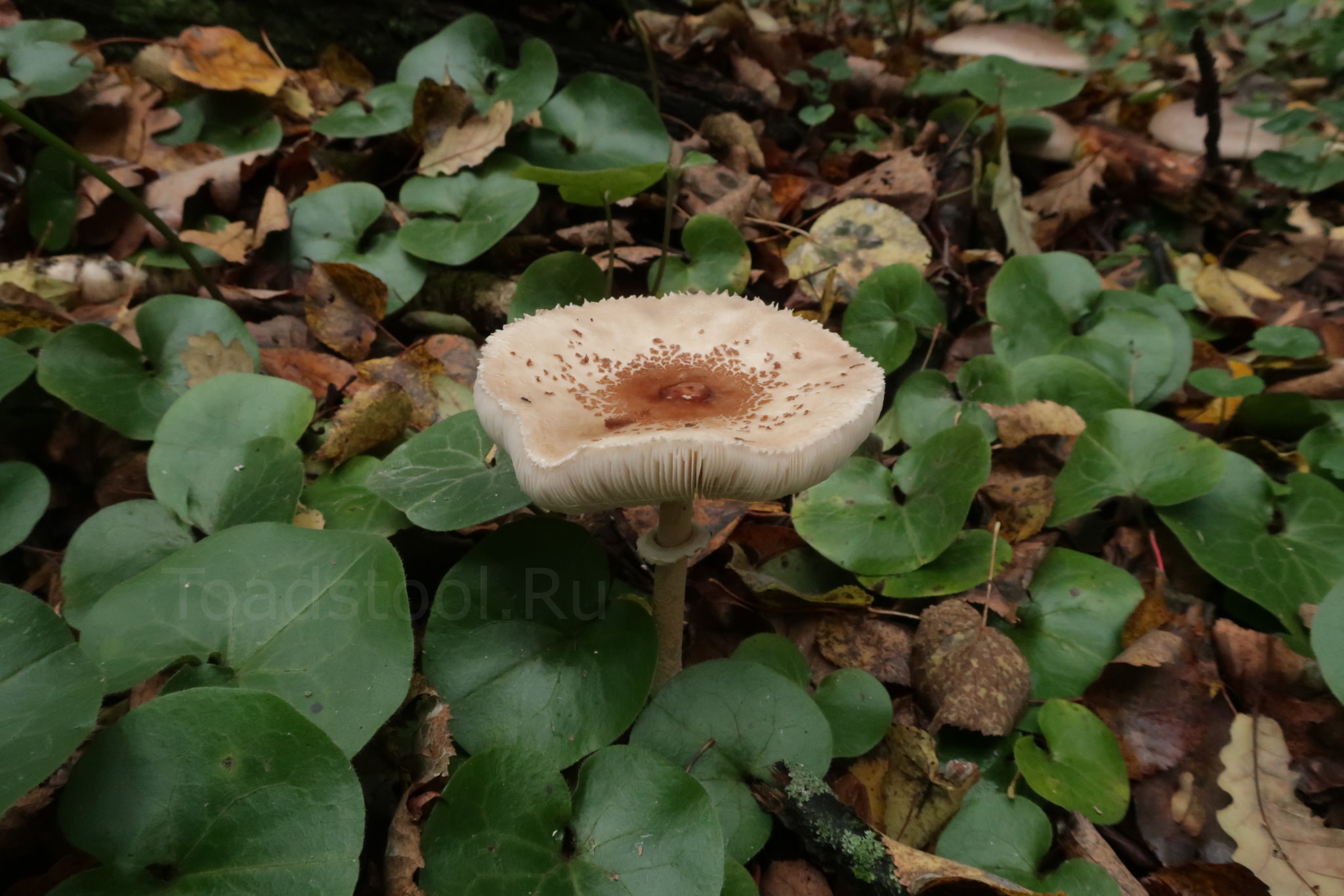 Молодой зонтик совершенно не похож на себя в зрелости. Здесь он подобен зонтику пестрому: темная кожица покрывает его шляпку целиком, делая гриб совершенно неузнаваемой. Скоро шляпка начнет раскрываться, и кутикула, не поспевающая за нею, лопнет и словно бы съежится, оставшись на поверхности в виде звездообразной нашлепки.