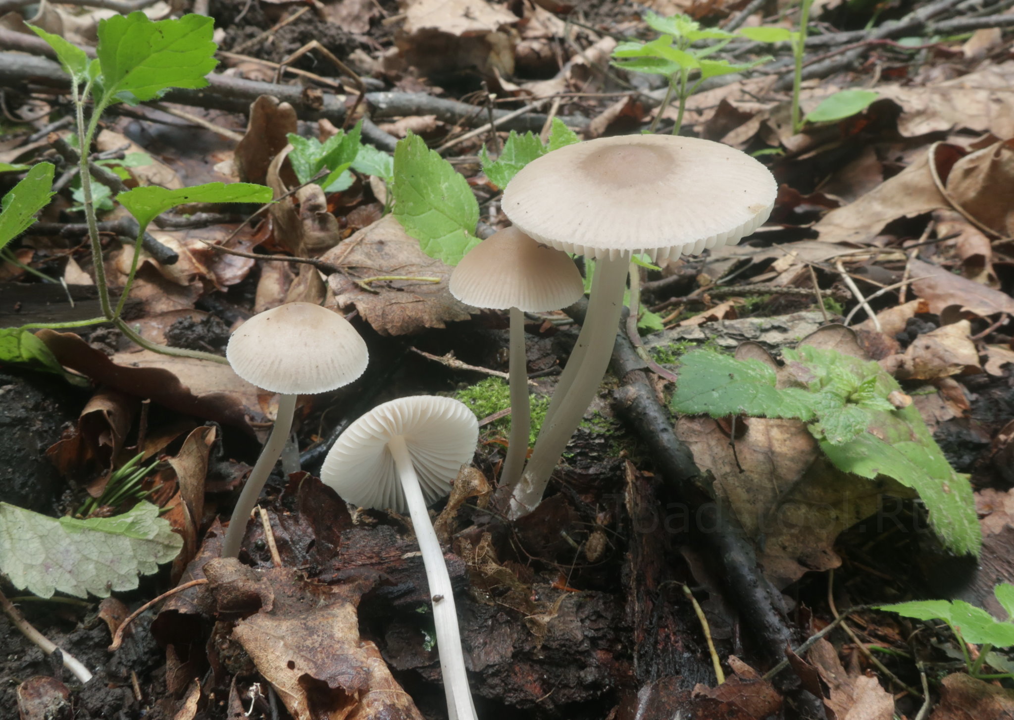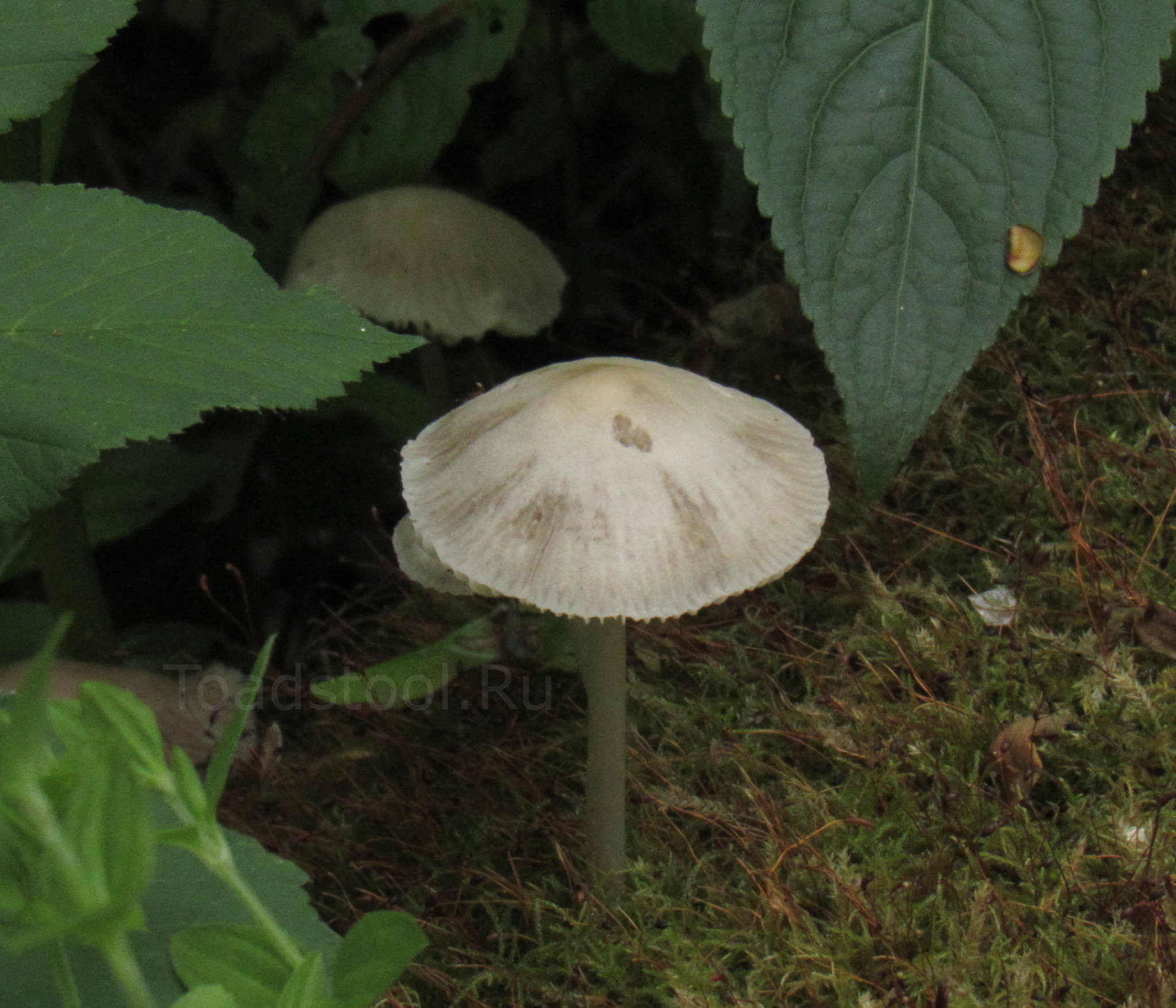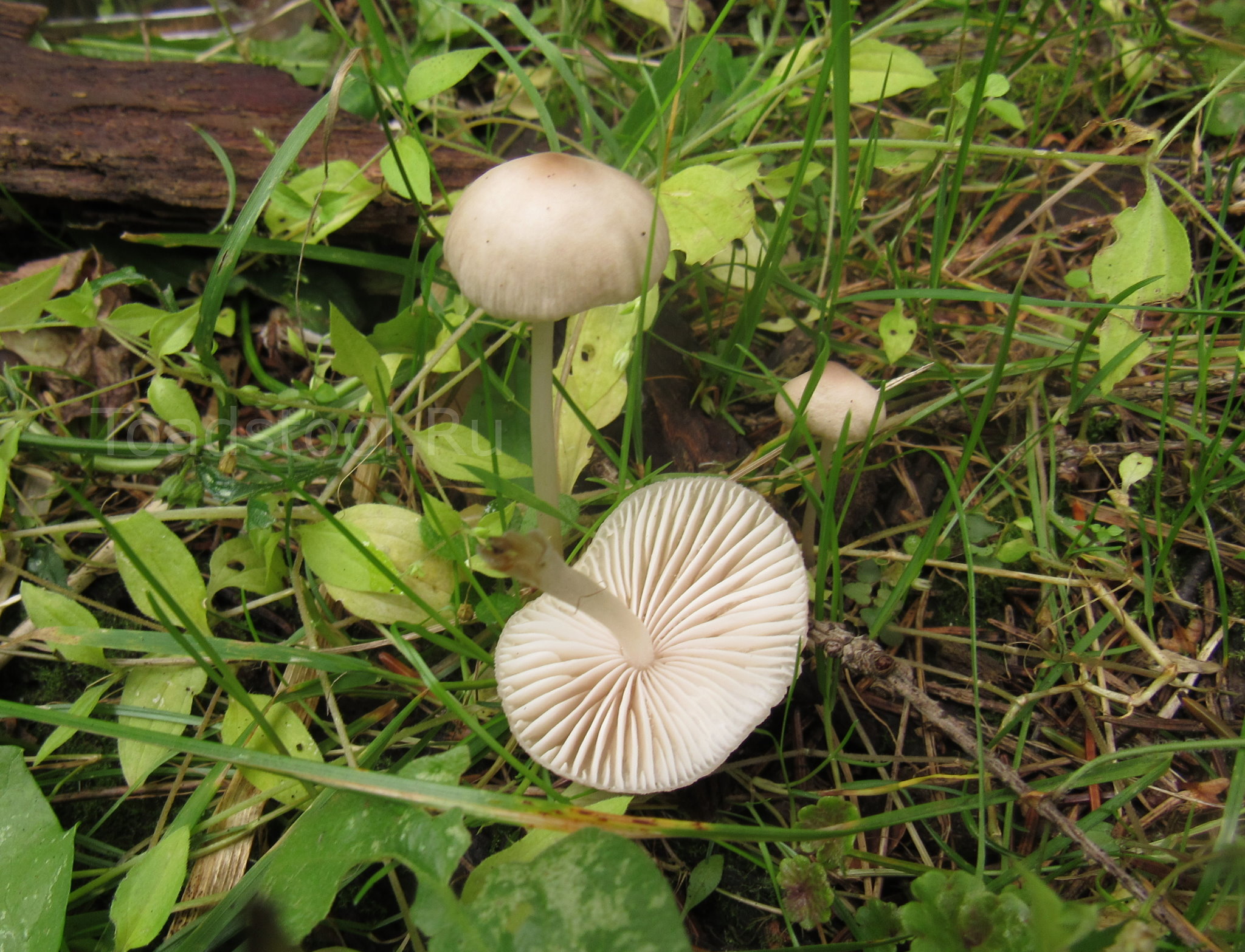 В огороде Mycena niveipes смотрится совсем иначе - напоминает то ли "луговик", то ли какой-то выцветший панаэлоус. Любопытно, что как раз такие отчаянные средства маскировки и выдают белоножковую мицену - если б не эти странности, она бы надежно затерялась в неприступных рядах своих сородичей.