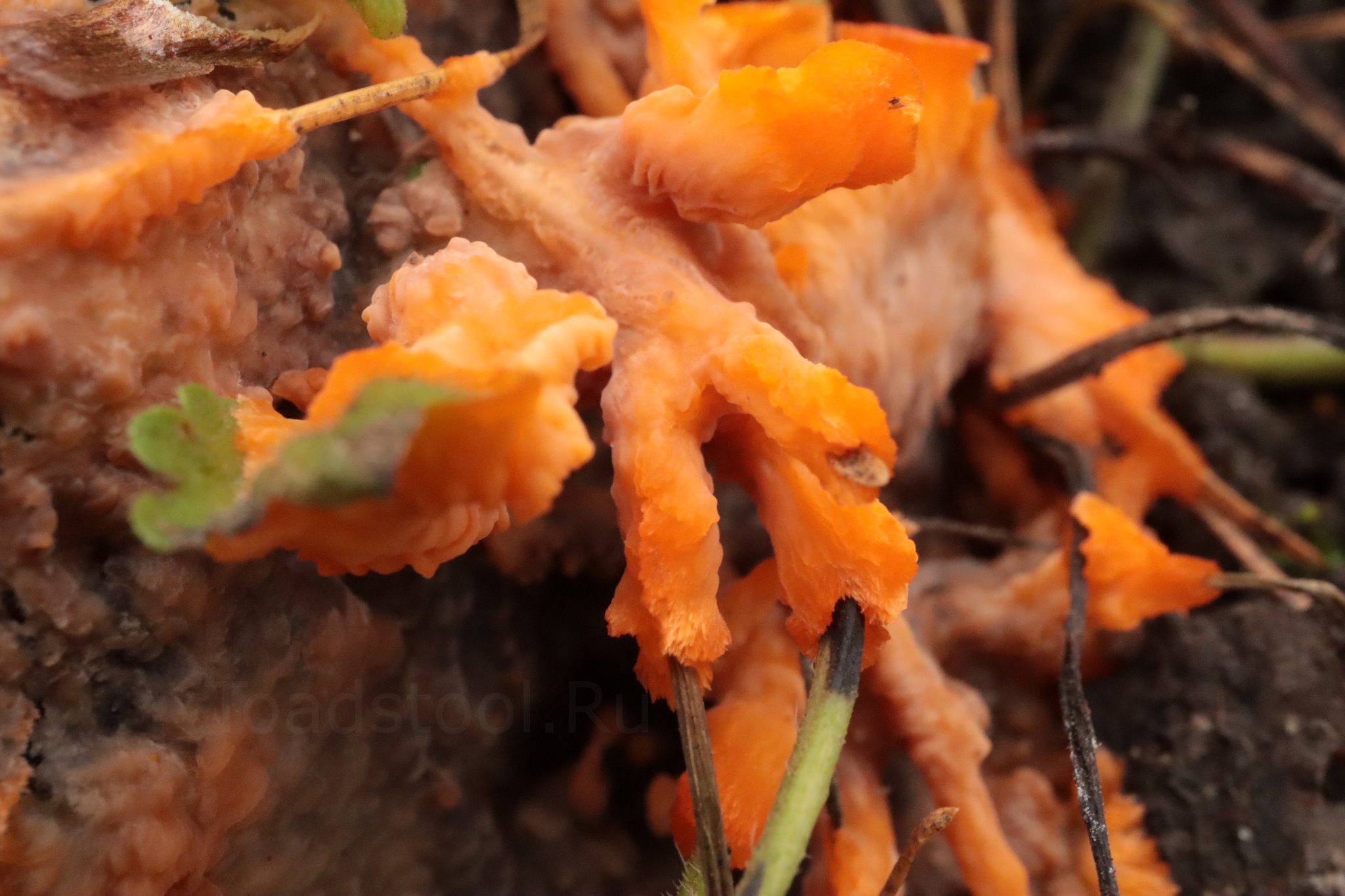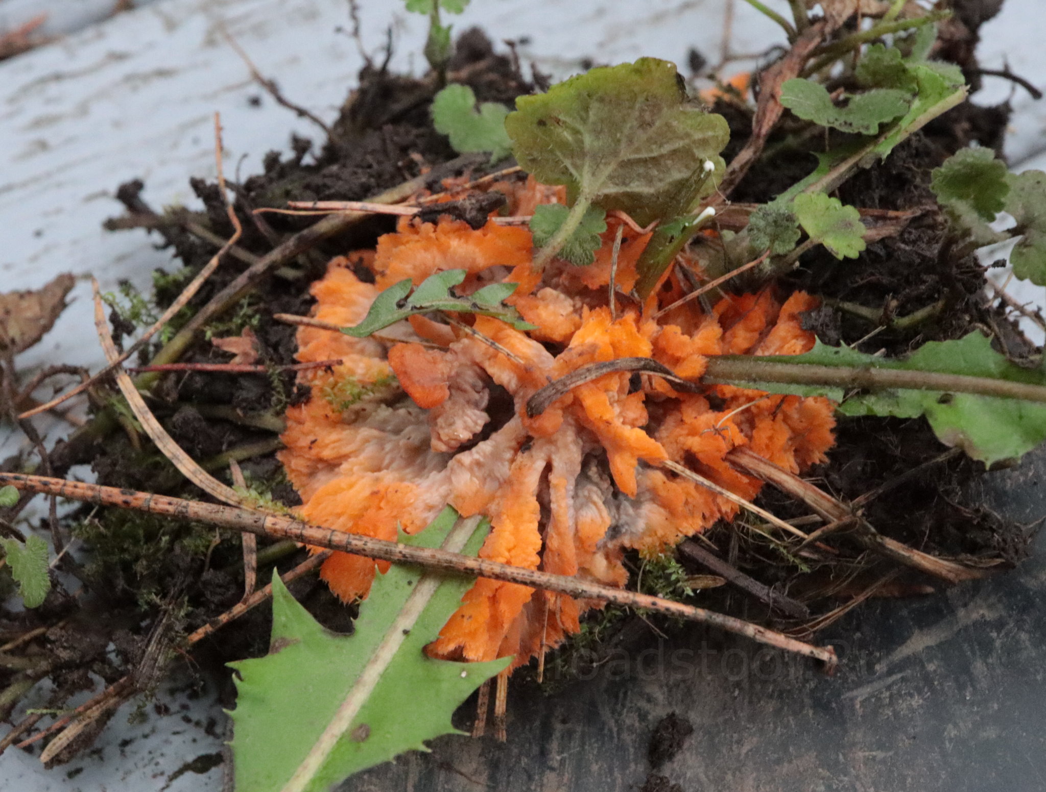 Сходные виды: Флебия радиальная в своей бесформенности не уникальна, однако «аналоговым методом» отличается вполне легко. Яркая окраска и выразительнейший складчатый гименофор говорят сами за себя.