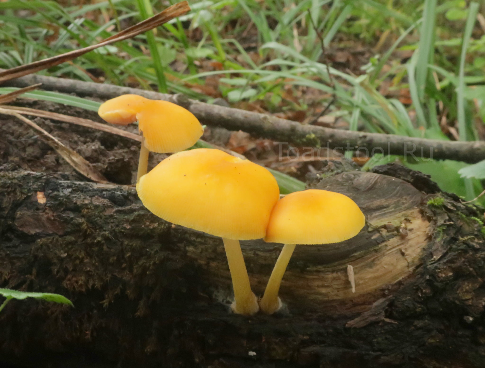 Шляпка: Небольшая и тоненькая (3-6 см в диаметре, изредка больше), вначале полушаровидная, выпуклая, затем постепенно раскрывается до полураспростертой, обычно сохраняя в центре тупой бугорок; края с возрастом становятся волнистые, лохматые. Стриатность ярко выражена (ключевой отличительный признак): пластинки просвечивают где-то на половине радиуса шляпки, а то и больше. Поверхность молодых шляпок бархатистая, особенно в центре, иногда морщинистая, но с возрастом разглаживается. Окраска очень приметная, разных оттенков желтого, в центре темнее, на периферии светлее; коричневых тонов нет, что тоже важно для определения. Мякоть совсем тонкая, желтоватая, без особого вкуса и запаха.