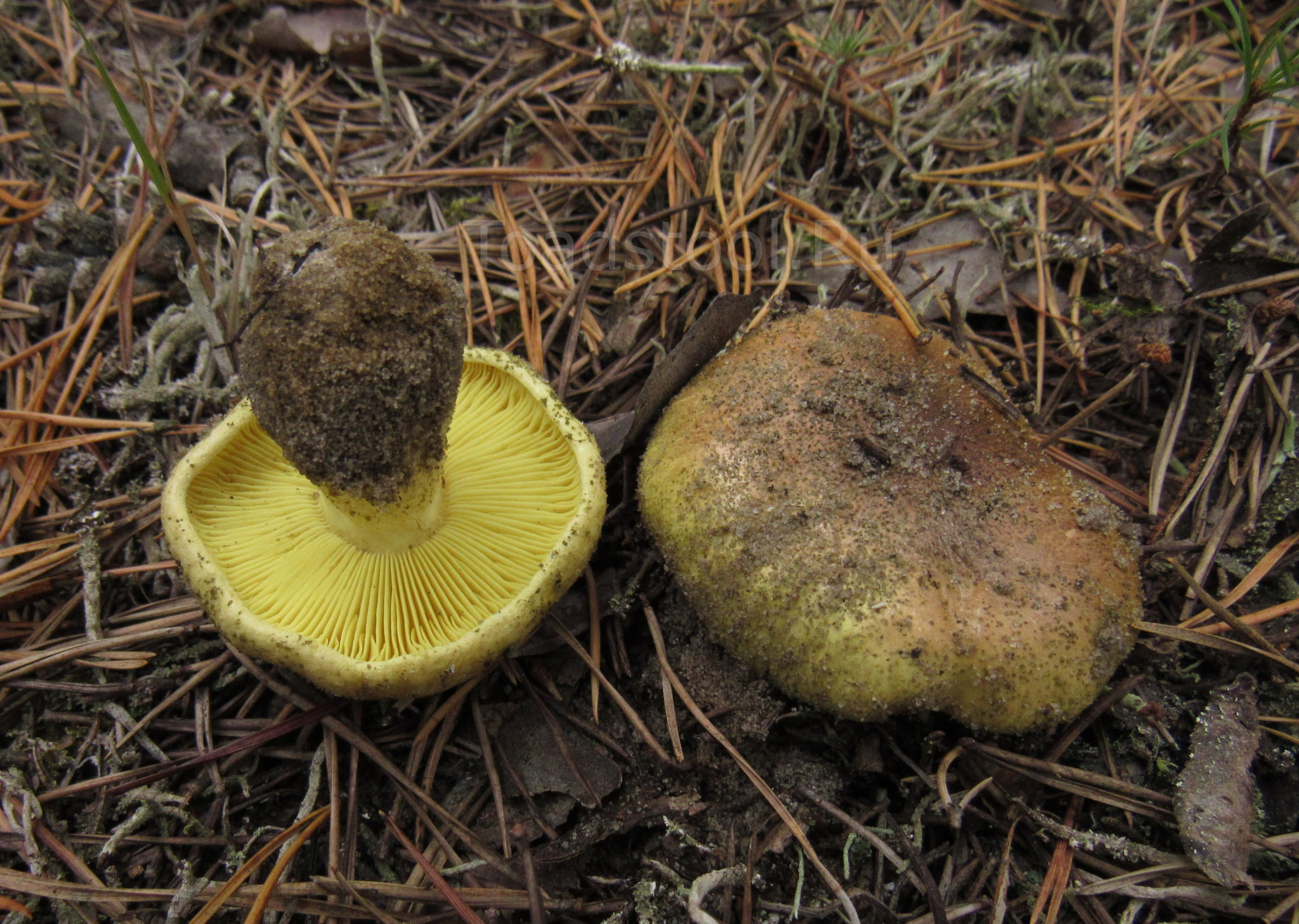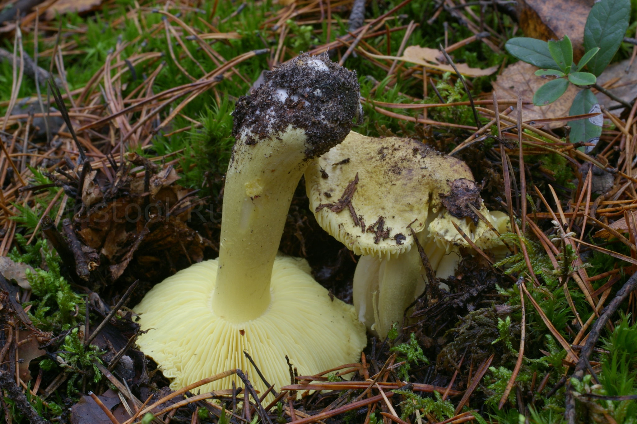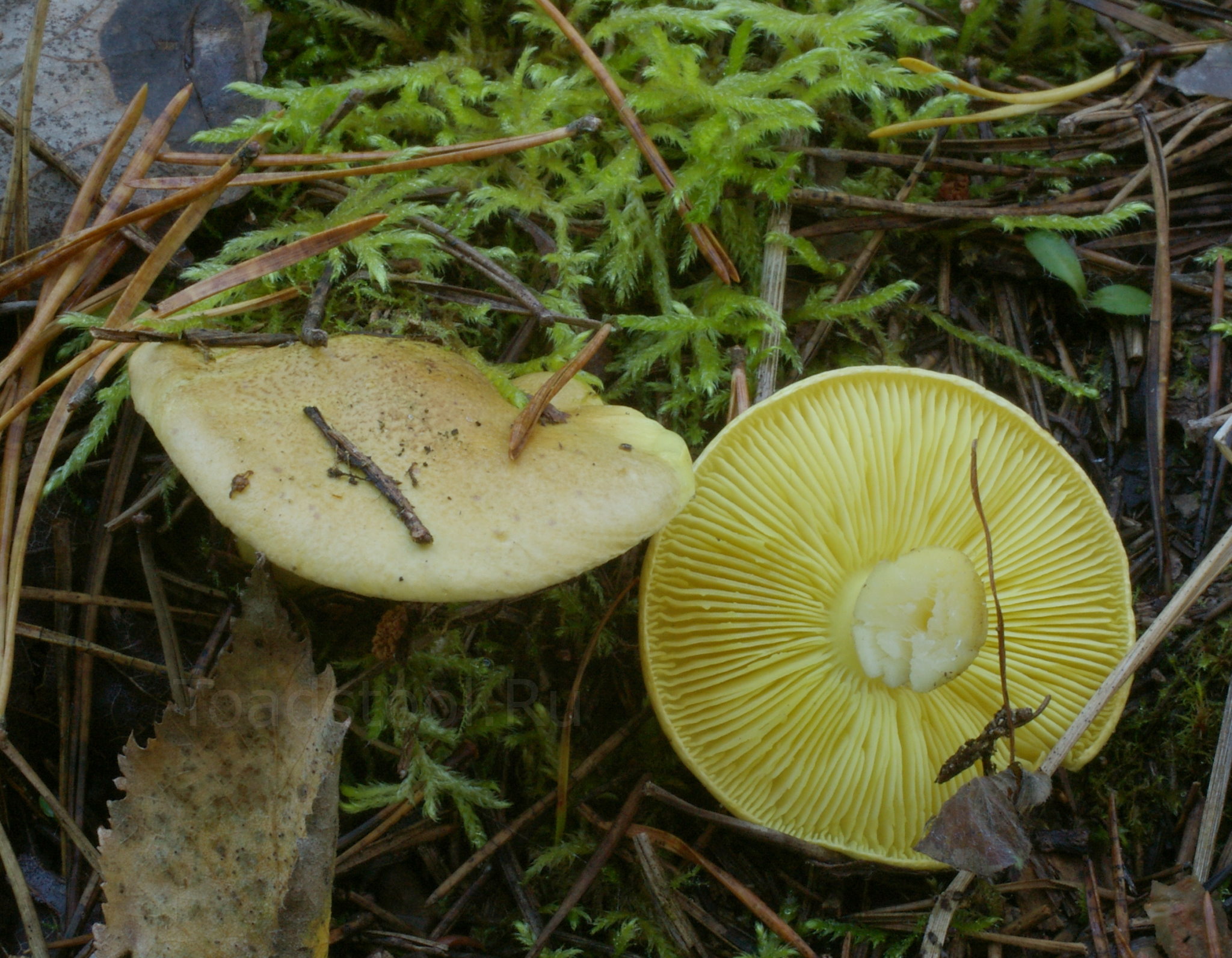 Гименофор: Пластинки частые, узко приросшие, широкие, лимонно-желтого цвета.