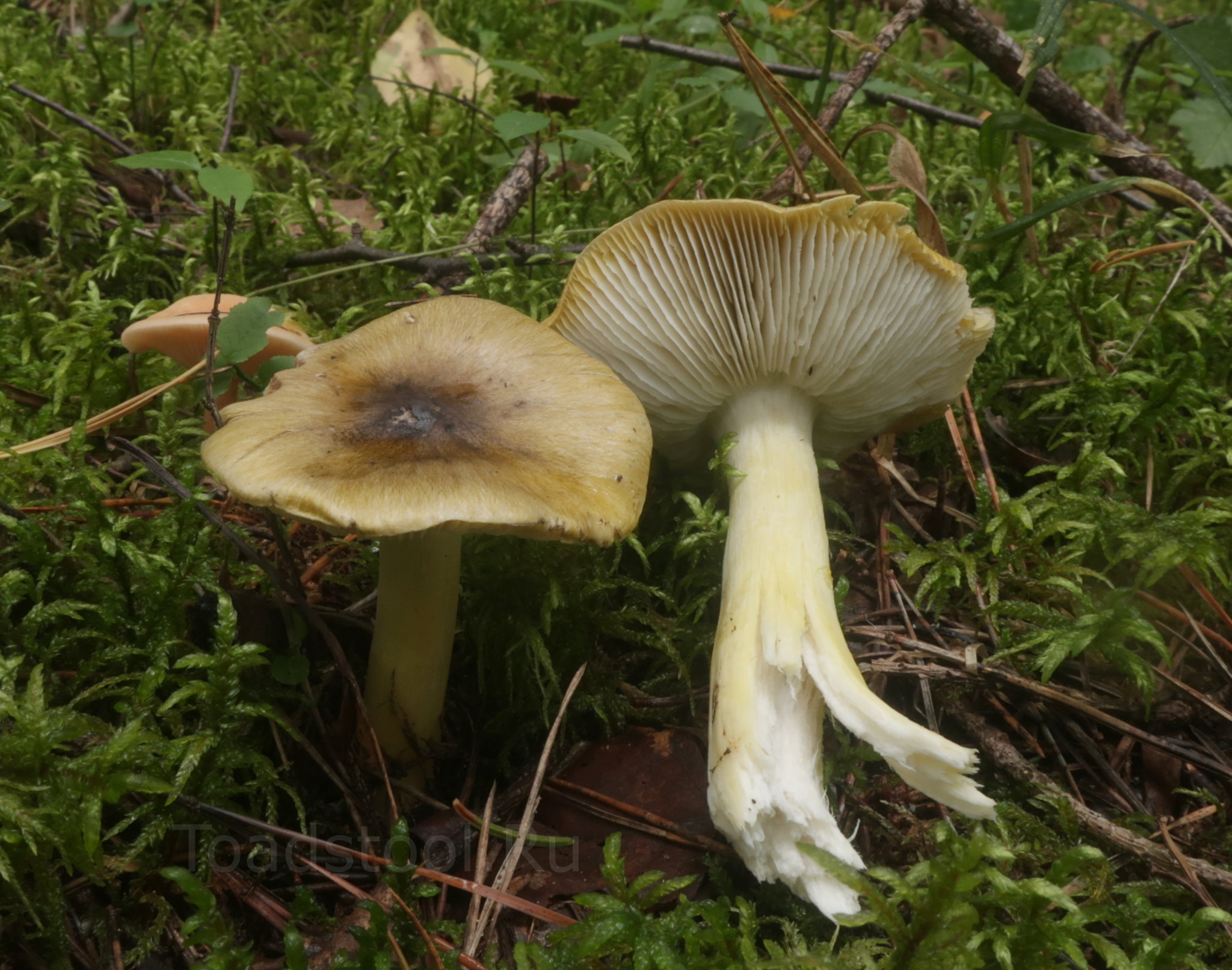 Гименофор: Пластинки выемчато-приросшие, средней частоты, белые или с прожелтью; у зрелых грибов обычно с желтой окантовкой на периферии.